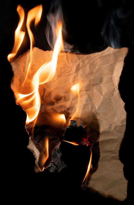 burning, 'fire-stricken' piece of paper-- in its first glowing spots, its