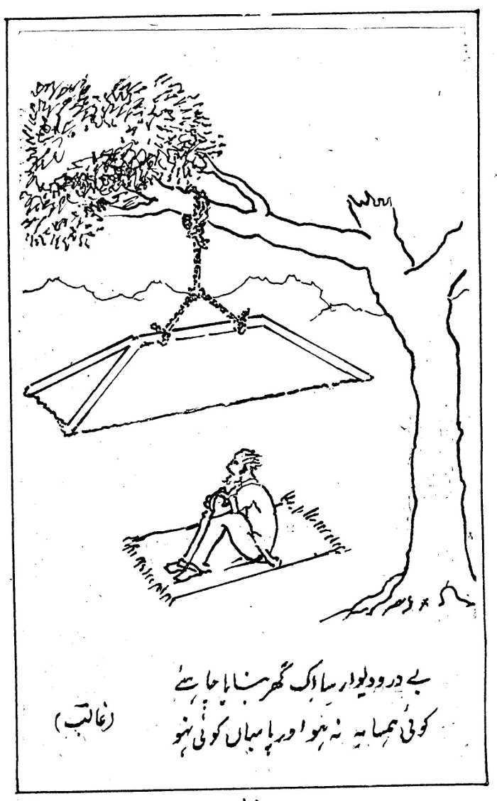 This is a very singular house-- not just 'a' house, but a 'single', or 'particular', or 'unique', or 'excellent' house' [ik ghar], a usage that nicely points up its unusualness and/or isolation. Bekhud Dihlavi imagines it as consisting of a wood frame in a field; and Bekhud Mohani, as consisting of a wilderness. The point is that we are left unable to imagine it. Its only peer is Majnun's house in {18,3}; many of the same kinds of uncertainty exist here. And the multivalence of ik , which can mean so many other things besides 'single', increases the range of our imaginings.