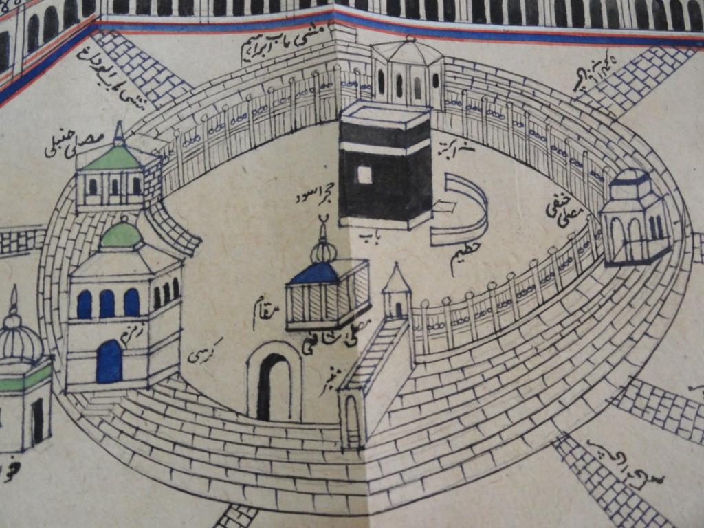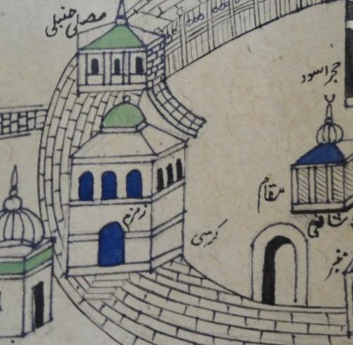In this anonymous drawing of the precincts of the Ka'bah, the well of Zamzam is located in the building with the blue windows and door (click on the image for the full drawing):
