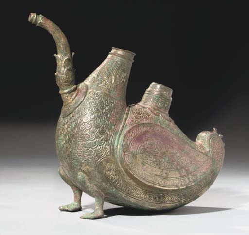 "A WHITE BRONZE BIRD AQUAMANILE, PROBABLY CENTRAL INDIA, CIRCA 17TH CENTURY. Of bird-like form, with two short webbed feet, and a curved body with two upper openings jutting upwards from the top and a large wing to either side, the tail upturned, spout protrouding from the chest, densely decorated all over with feather-like patterns and areas of scrolling, particularly along the bottom and within a contained area in the wing, areas of corrosion. 7 7/8in. (20cm.) at highest point."