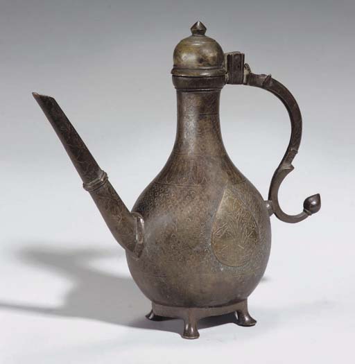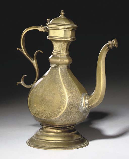 "AN INDIAN ENGRAVED BRASS EWER, PROBABLY DECCAN, CENTRAL INDIA, 17TH OR EARLY 18TH CENTURY. Of octagonal-section drop shape rising through a boss to the deep octagonal bowl mouth, with scrolling handle, S-shaped spout, and hinged lid on stepped flaring foot, the main body of the ewer decorated with bands of scrolling arabesques on a dotted ground forming drop-shaped panels containing similar medallions, foot possibly a slightly later addition. 13in. (33cm.) high."