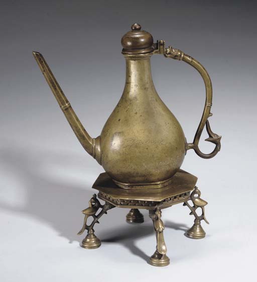 A brass ewer with an ornate stand, 1700's