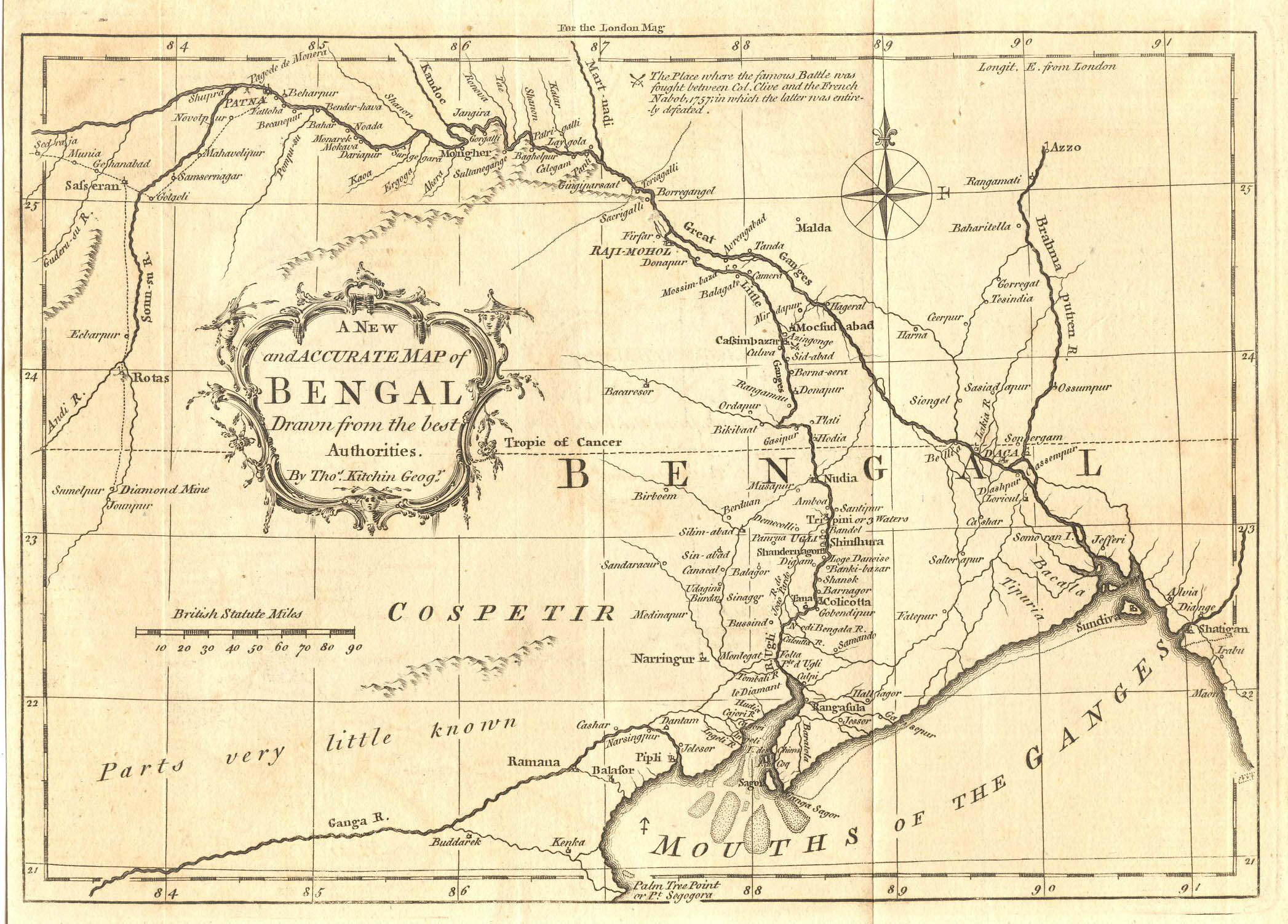 "A New and Accurate Map of Bengal," by Thomas Kitchin, drawn for the London Magazine, 1760; CLICK ON THE MAP FOR A VERY LARGE SCAN