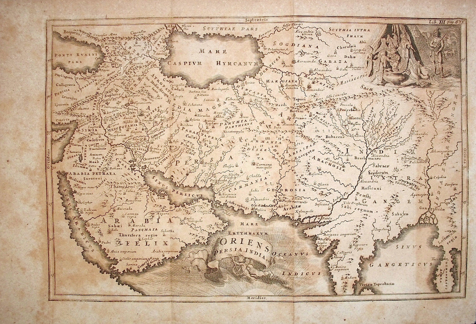 "ORIENS, PERSIA, INDIA etc.; by Christophorus Cellarius (C. Keller), probably from the decorative 1732 edition of Geographia Antiqua, containing maps illustrated with scenes of History, Mythology or Religion. Folding map, copperplate engraving and hand coloring with decorative vignette representing the Decollation of Saint John the Baptist and the Crucifixion in the background. It shows Asia from Arabia to India extra Gangem. Image size: 8" by 12" (205 x 305 mm) plus margins.