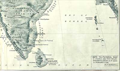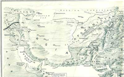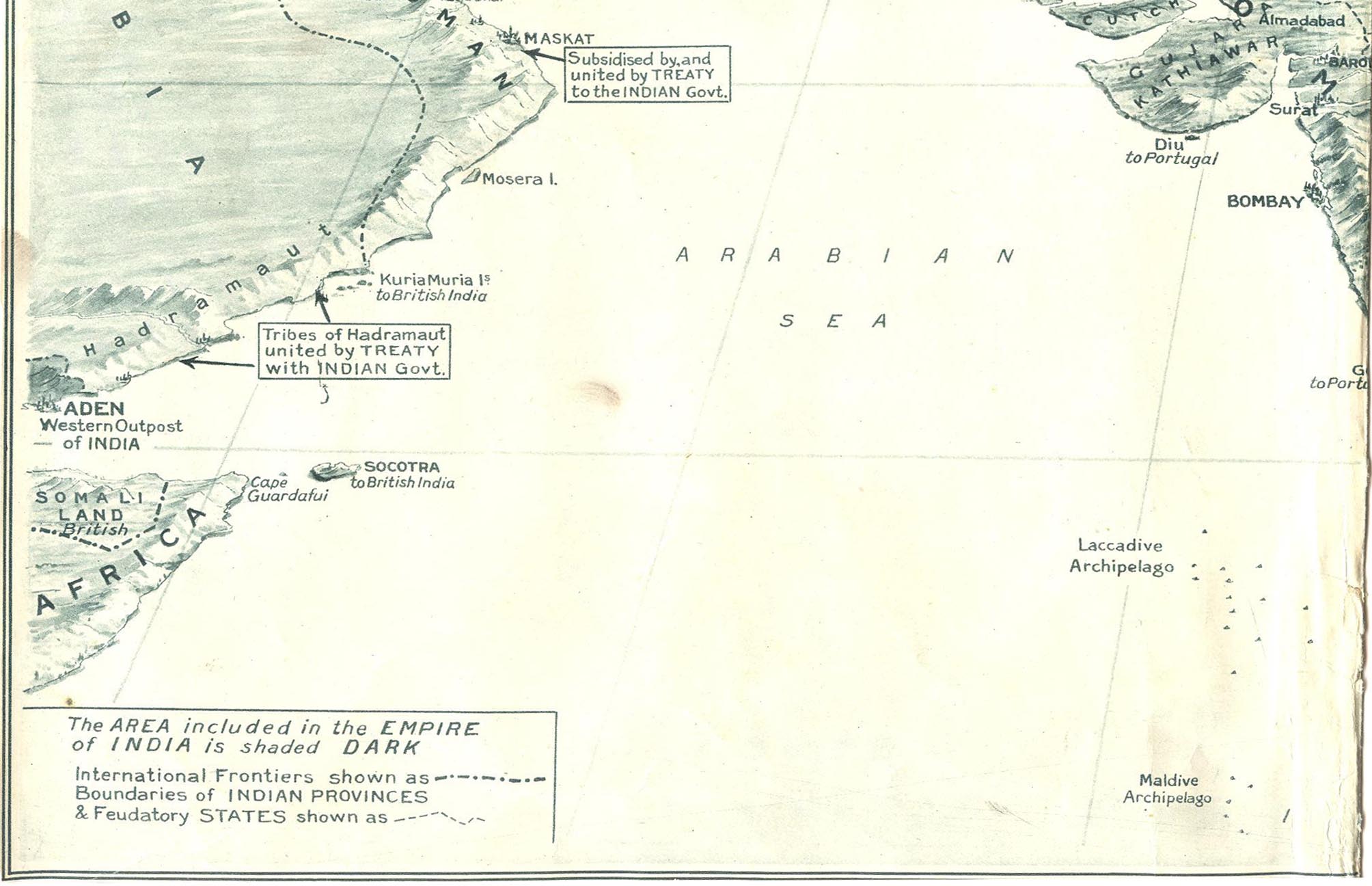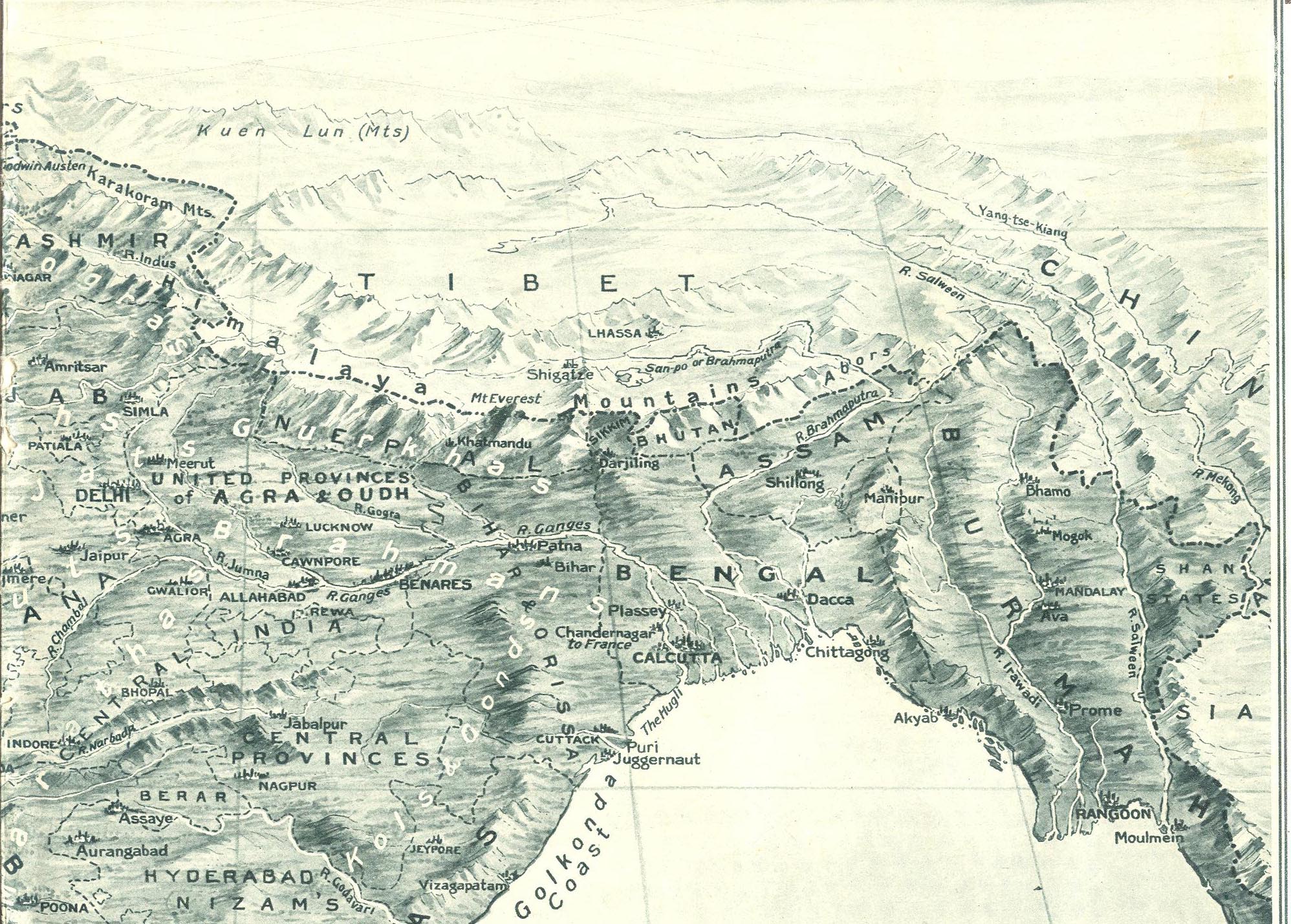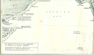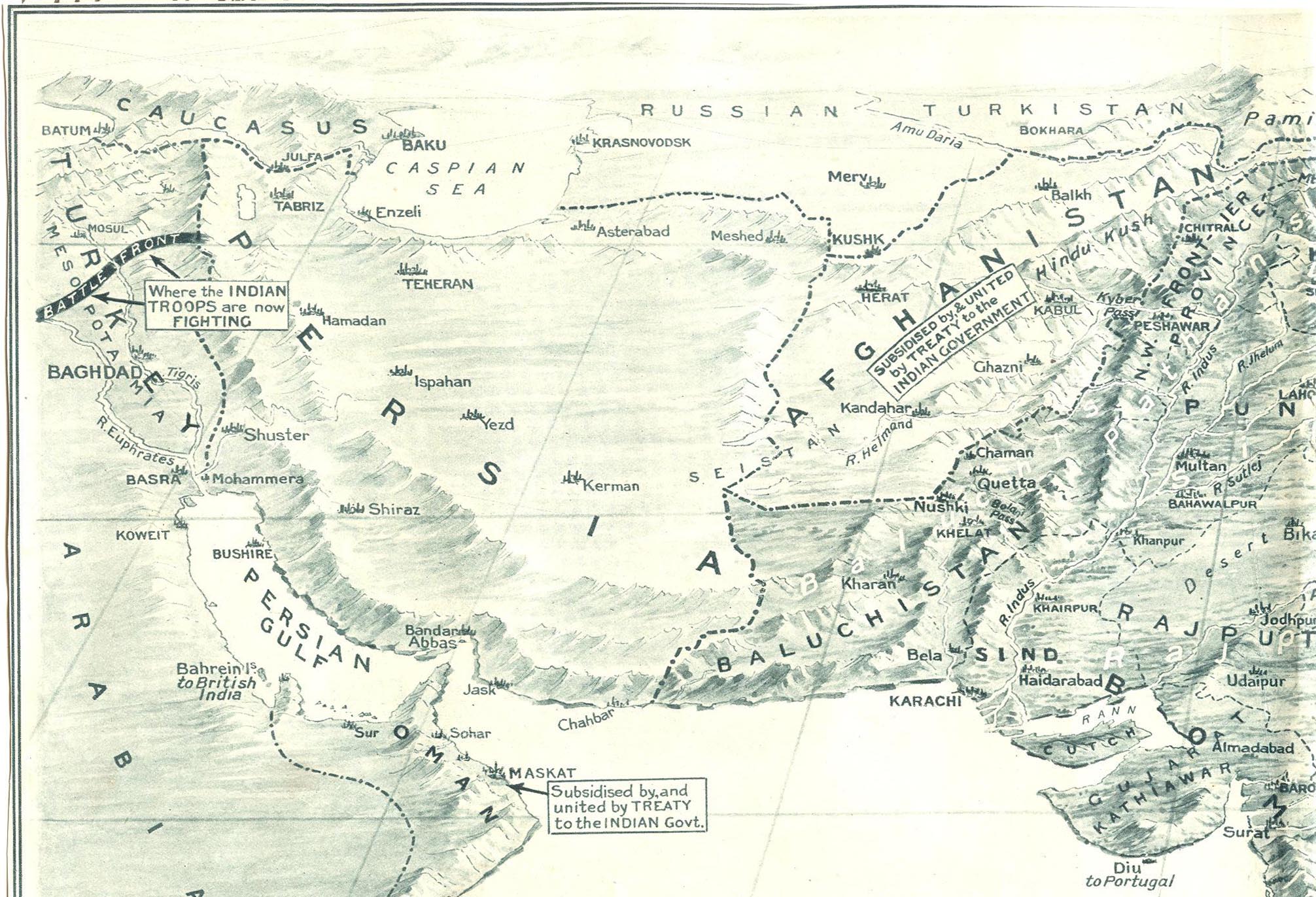"The Empire of India, whose suzerainty extends from Aden in the west to Tenasserim in the east, a span of 3000 miles, has for over 3000 years produced a succession of warrior peoples, the bulk of whom, descended from the Aryans, are racially believed to be derived from the same great family as the English, for whom they have so often fought during the last century. The Warrior Clans, indicated above in white lettering, have each figured prominently in the past history of India, having built up in succession powerful States, which are now, instead of engaging in exhausting internecine war, cemented ... whole, whose gallant troops are fighting gloriously side by side ... country whose beneficial administration has made this ... [parts of the caption had been torn away]