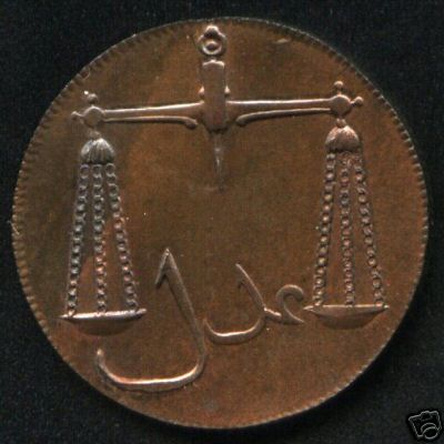 A Bombay-minted half-anna coin from 1794: the left side promises "justice" ('adl)