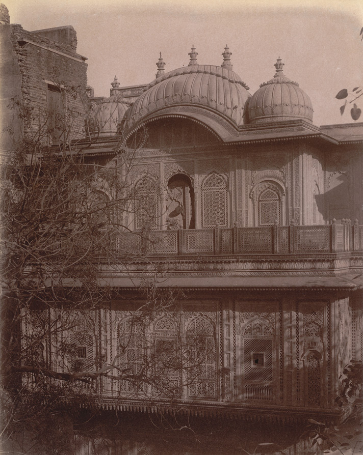 *Close view of upper storeys of the Zamindar's House, Fatehpur Sikri, a photo by Edmund William Smith, 1893* (BL);