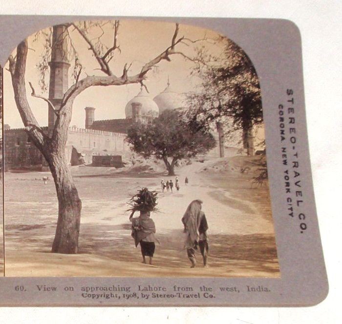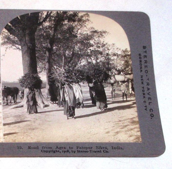 *"Road from Agra to Fatepur Sikra," a stereoscopic view, 1908 (women carrying head-loads of firewood)*; also: *"View on approaching Lahore from the west"*