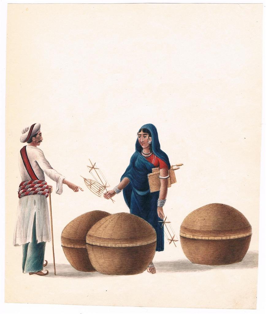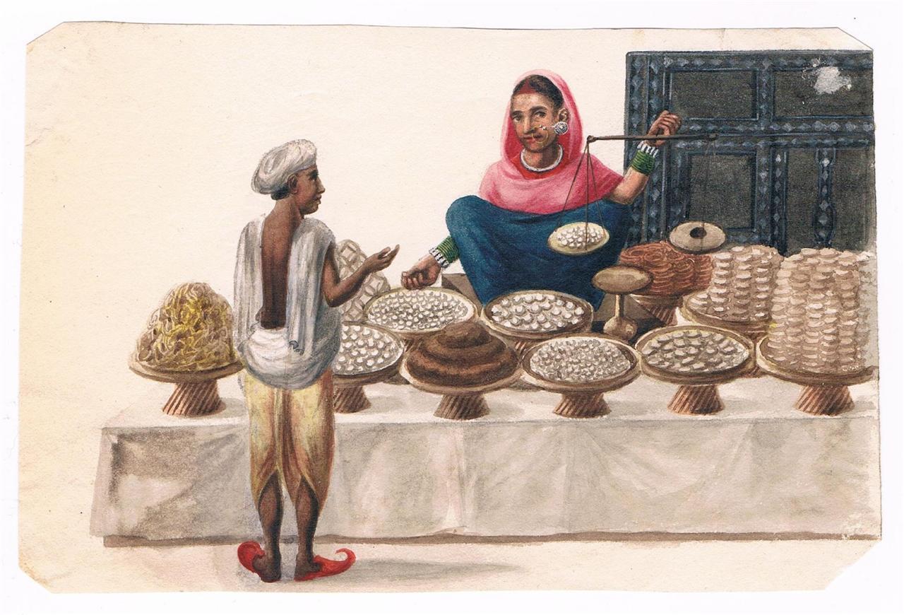 A basket and fan seller, Patna, 1819; from a set of Company School watercolors of various trades; also a *roadside sweetseller*
