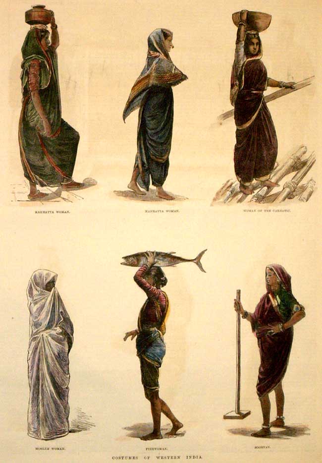 "Costumes of Western India: a Mahratta woman [carrying water]; another Mahratta woman; a woman of the Carnatic [carrying a bowl]; a Moslem woman; a Fishwoman [with her wares]; a Soortan [with an implement (?)]," from the Illustrated London News, 1876 (with later hand coloring)