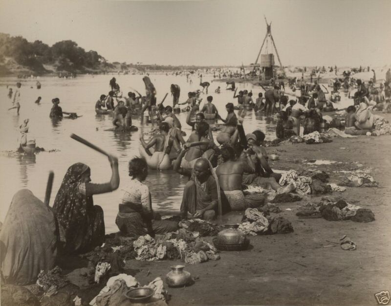 "Saburmatee River, Ahmedabad"-- women washing clothes, late 1800's or early 1900's