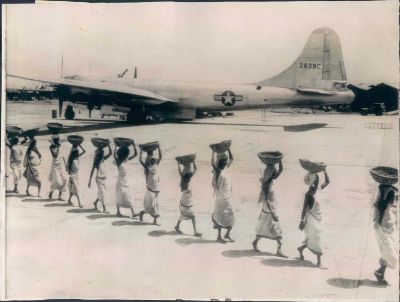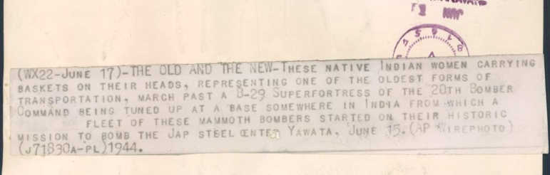 *Women porters carrying head-loads past a B-29, in 1944*, in a news bureau photo; and *the original caption*
