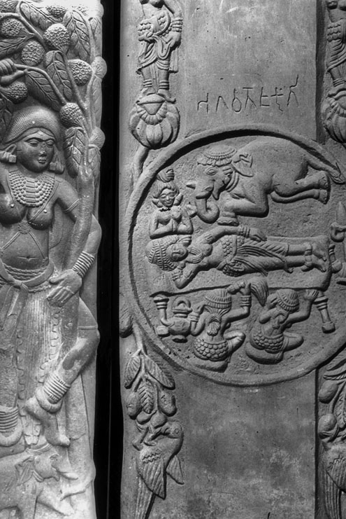 "Conception of the Buddha-- Queen Maya's Dream. Medallion on stupa gate railing, red sandstone, Bharhut, Shunga period, 100-50 BCE."