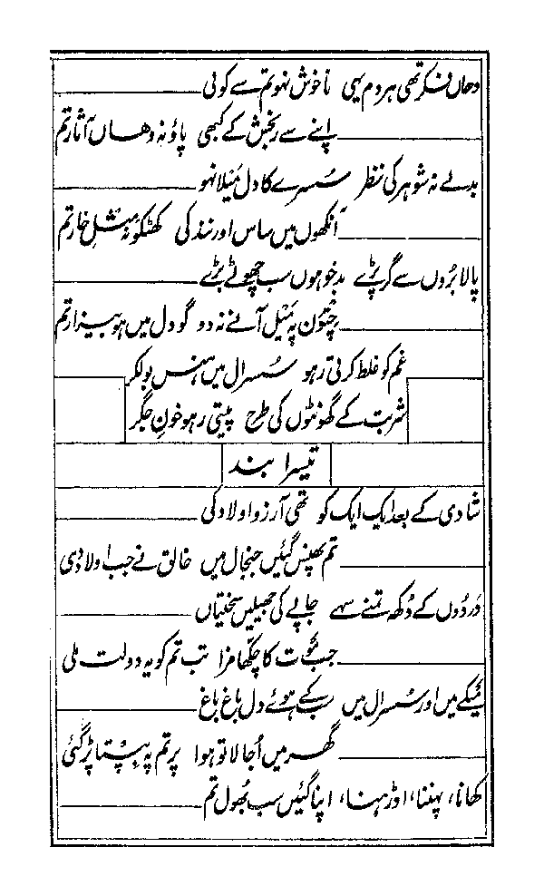 nah shauhar kii na:zar susre kaa dil mailaa nah ho aa;Nkho;N me;N saas aur nand kii kha;Tko nah mi;sl-e ;xaar tum |