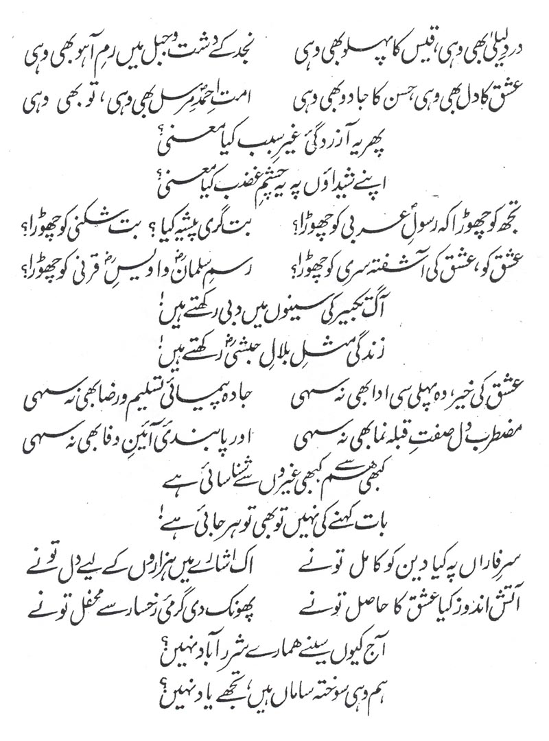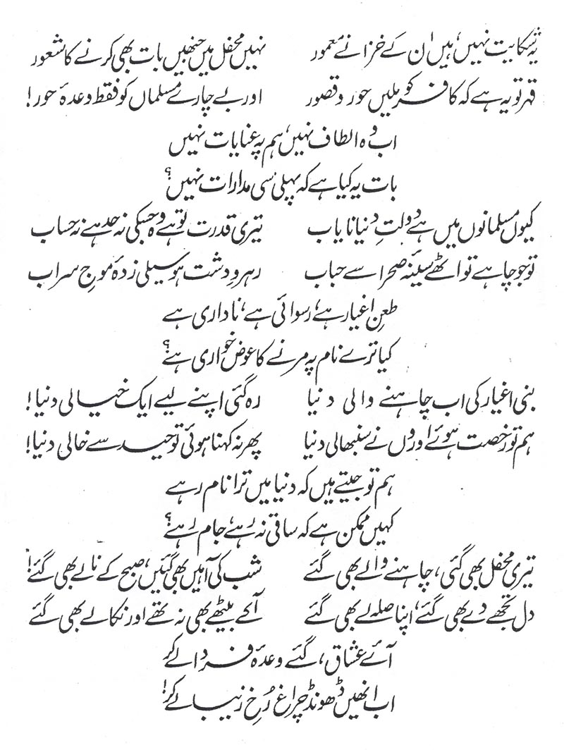 'Javab', stanza 12. ==Of course, the fact that ;huur-o-qu.suur is such a euphonious phrase has a lot to do with the structure of the verse. ==This verse strikes many modern readers as being vulgarly materialistic and beneath Iqbal's dignity; but there it is, and the exclamation point is his too. |